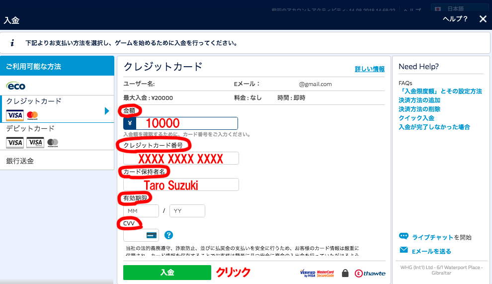 ・クレジットカード(VISA/Master)で入金の場合