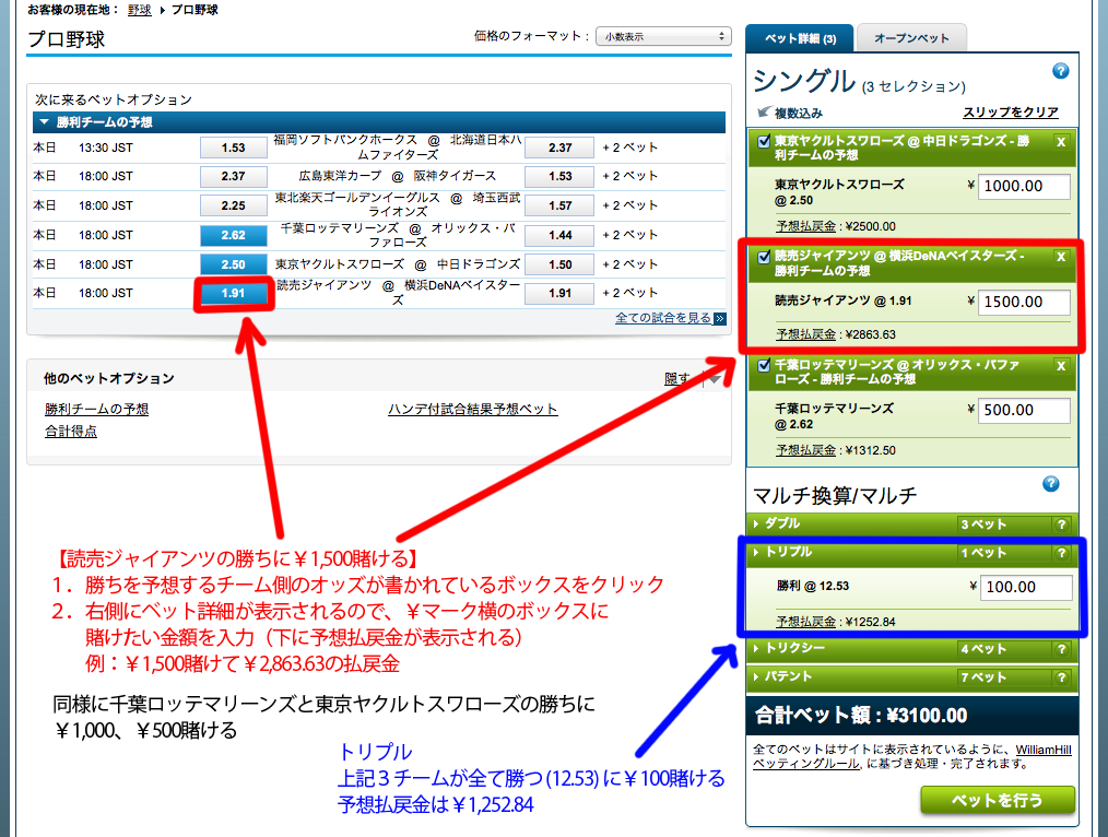 下記の場合は、ヤクルトの勝ち(2.50倍)、巨人の勝ち (1.91倍)、千葉の勝ち (2.62倍)に