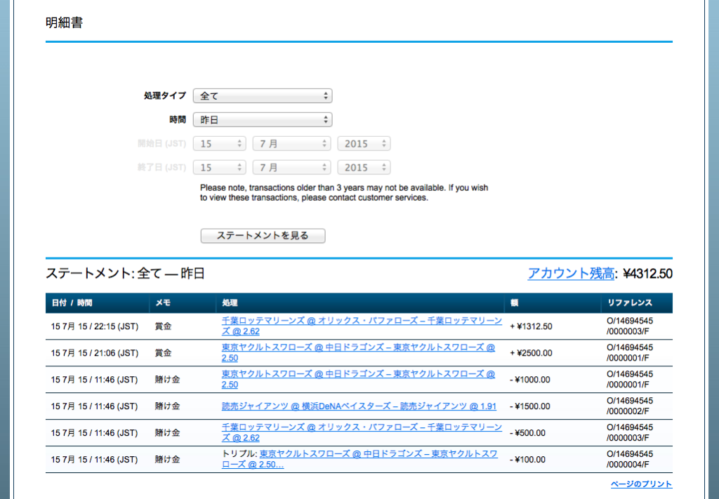今回は、¥3100.00の賭け金で、¥3812.50の払い戻し、よって¥712.50の勝ちでした