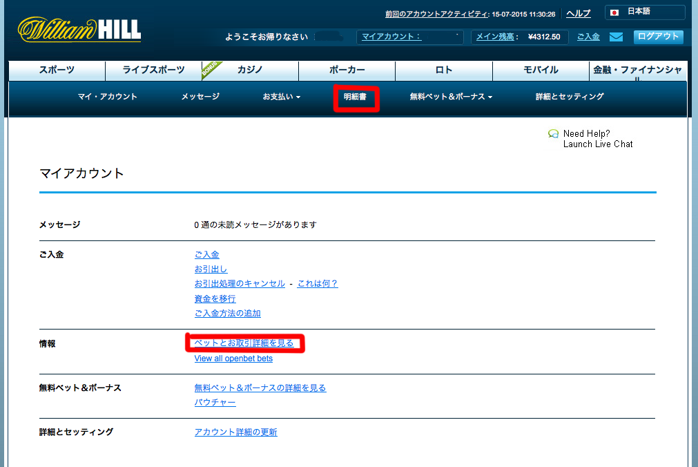 上部真ん中あたりの明細書、もしくは情報のところのベットとお取引き詳細をクリック